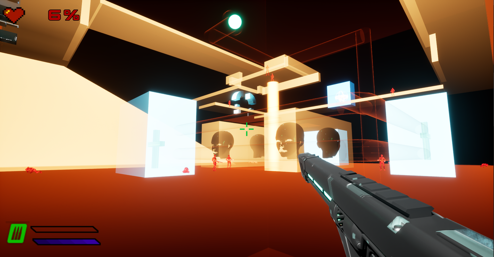 The game is a prototype that sports twelve different rooms, three different enemy type with unique behavior and attacks, and one weapon & ability pick-up.